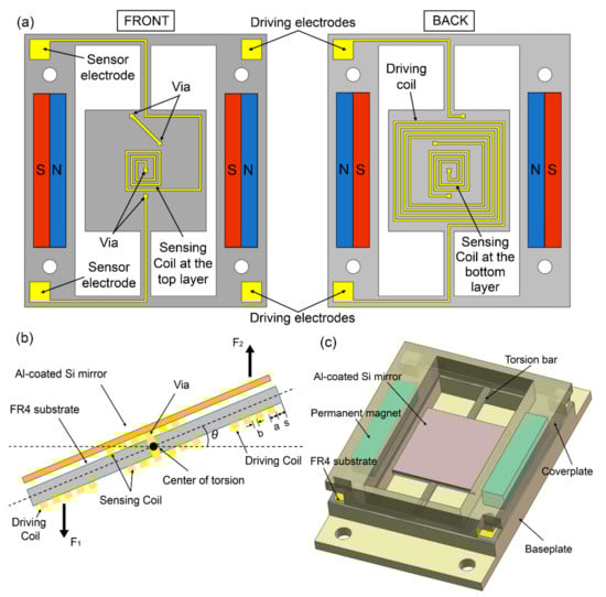 - Tseng, V.F.G.; Xie, H. Simultaneous piston position and tilt angle sensing for large vertical displacement micromirrors by frequency detection inductive sensing. Appl. Phys. Lett. 2015, 107, 214102. [Google Scholar] [CrossRef]