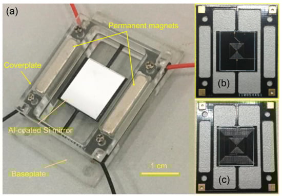 - Gokdel, Y.D.; Sarioglu, B.; Mutlu, S.; Yalcinkaya, A.D. Design and fabrication of two-axis micromachined steel scanners. J. Micromech. Microeng. 2009, 19, 1403–1407. [Google Scholar] [CrossRef]