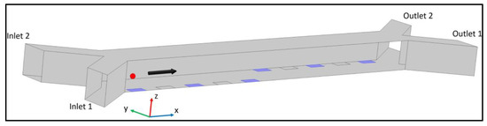 Microchannel design with two arrays of electrodes on opposite sides of the microchannel. Two different fluids enter the microchannel from inlet 1 and inlet 2. The cells (denoted as red object), suspended in a medium, are introduced from inlet 1, and are captured from outlet 1 in the same medium for dipping, and from outlet 2 during medium exchange process. The flow direction is from left to right, as indicated by the arrow.