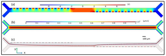 The simulation results from COMSOL Multiphysics 5.2 showing (a) the electric potential inside the channel after AC 15 Vp-p (Volts) is applied to the electrodes; (b) the x-component of the velocity field (µm/s) when fluids from two different inlets are introduced into the channel at the same flow rates; and (c) the trajectory followed by the microparticles in the microchannel showing successful dipping operation. The red circles represent the particles, whereas the streamlines of both the fluids are represented in blue and red colors. Both the fluids flow from left to right.