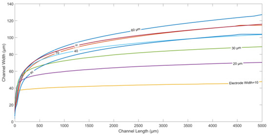 Figure 3 depicts the particle trajectories along the width of the channel for different values of electrode length, and the spacing between two adjacent electrodes. Both the electrode length and spacing are increased equally from 10 µm to 100 µm, keeping all other parameters constant. Moreover, the channel length is kept fixed at 5000 µm in all the cases. It is observed that the displacement of the microparticles along the width at the end of the channel increases initially on increasing electrode length/spacing, until it reaches a maximum value at length/spacing of ~60 µm. Thereafter, the final displacement along the width of the microchannel starts decreasing as the electrode length/gap is further increased. At smaller length/gap, the nDEP force, although stronger in magnitude, is confined to only a smaller effective area above the electrodes. Increasing electrode length/gap reduces the magnitude of the DEP force closer to the electrodes, and increases this area of influence for DEP force, causing the particles to be pushed farther into the microchannel. However, a reverse trend is observed on further increasing electrode length/gap after a certain threshold value. After the optimized gap length, the increased spacing between the electrodes decreases the repulsive nDEP force, causing a decrease in the steady-state deflection along the width of the channel for the particles.