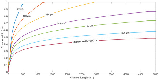 Particles trajectories for different channel width values generated using FEM. Applied frequency: 10 kHz. Medium conductivity: 10 mS/m. Medium density: 1000 kg/m3. Density of the particle: 1050 kg/m3. Diameter of the particle: 5.6 µm. Electrode/gap width: 60 µm. Flow rate of both fluids: 5 µL/h. Applied voltage: 10 Vp-p.