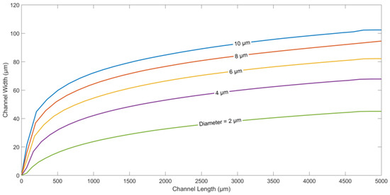 The next parameter studied is the diameter of the microparticles. Figure 5 shows the trajectories of particles with different diameters. DEP force, as indicated in Equation (1), is proportional to cubic radius of the particle. On the other hand, the drag force is proportional to only . It is evident that larger the particle size, the larger the DEP force will be, and the higher the displacement in the direction along the width of the channel.