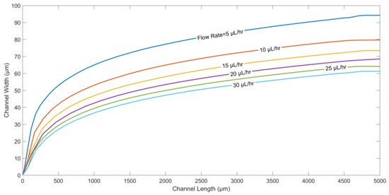 In Figure 6, the particle trajectories for different flow rates are generated. The flow rate directly affects the displacement of the particle in the direction along the channel length. Figure 6 suggests that as the flow rate of fluids is decreased, microparticles are pushed deeper into the channel along its width, since the drag force plays a dominant role compared to the other forces.