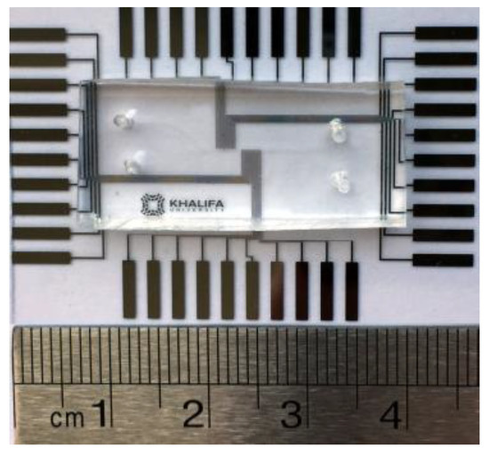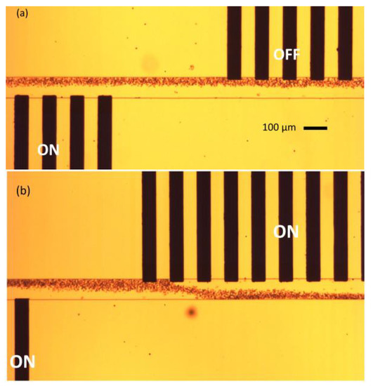 The PDMS-based microdevice (Figure 8) to perform the dipping operation successfully is fabricated using standard photolithographic techniques. The microdevice comprises of microelectrodes patterned on a glass wafer bonded with the PDMS channel. The two layers of the device are fabricated separately. A layer of gold (Au) is sputtered on the glass wafer (4 inch diameter and 500 µm thick), after depositing a thin layer of chromium (Cr) on it. The thin Cr layer improves the adhesion of the Au layer on the glass wafer. Next, a positive photoresist Shipley PR1800 (MicroChem Corp., Westborough, MA, USA) is spin-coated, exposed to ultraviolet light using a photolithography system (KLOE 650, KLOE, Montpellier , France), and developed in MF319 developer (MicroChem Corp.), at room temperature, to pattern the photoresist layer on the glass wafer. The exposed Au parts are then etched away, while those protected by the positive photoresist remain unaffected. Next, the Cr exposed layer is etched away using Cr etchant. In the next step, the photoresist is stripped off using acetone, leaving behind the Au microelectrodes on the glass wafer. Finally, the glass wafer is diced so that each piece can be used as a separate device.