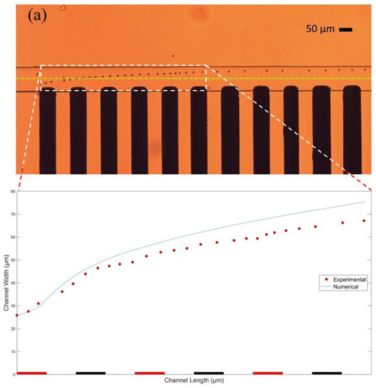 In order to make the PDMS microchannels, an SU-8 2025 mold is first patterned on silicon (Si) wafer. Separately, the PDMS base and curing agent are mixed at 10:1 by weight. The mixture is then poured on the mold, degassed, and finally cured at 80 °C for two hours. Both the glass wafer and the PDMS microchannel are cleaned in plasma cleaner, and then aligned under the microscope before they are thermally bonded to each other. A few droplets of ethanol are used to delay the bonding process between the PDMS and glass, and perform the alignment. The microdevice is fabricated using the optimized geometrical parameters—e.g., electrode width, electrodes spacing, channel width, etc.—obtained from numerical analyses.