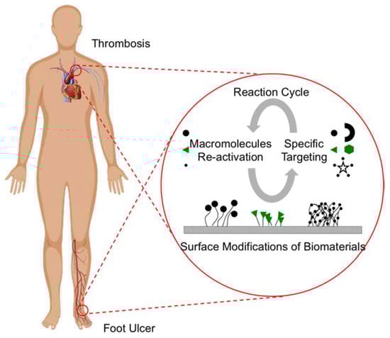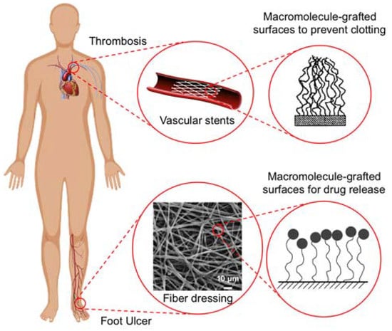 The primary function of the injectable and implantable biomaterials is to provide therapeutic performance locally. Surface grafting of macromolecules not only enhances the compatibility of the materials with surrounding tissues, but it also can be utilized as the module for drug delivery (Figure 1). In the former case, we emphasize the review of vascular stents and their surface coatings. This is to provide an alternative strategy toward the traditional bare metal stents and the newly developed drug-eluting stents, where the goal of the coating is to prevent secondary blood clotting. In the latter case, we address the ability to control the release of macromolecules that were attached to the surface of the polymers that were intended for use in topical applications, such as wound dressing. Another function of surface grafting of macromolecules includes tissue engineering for the promotion of cellular responses. In addition to the surface grafting of macromolecules, we review the types of macromolecule-grafted surfaces and their interfacial effects with surrounding tissues. In general, our review provides an update on current technologies and trends in thrombosis prevention and dressing for wound healing. By using polymers with modified surfaces, which were serving as active sites for biomedical functions, the device can achieve their therapeutic performance for the disease states.