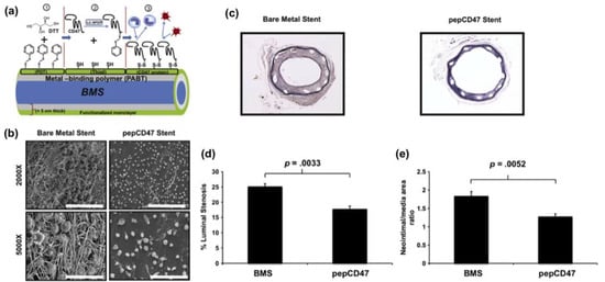 (a) Schematics of chemical modifications to attach CD47 proteins on the surface of bare metal stents. (b) Comparison fibrin deposition and trapped cells using scanning electron microscope (SEM) images on surface characterizations of an explanted endovascular stent in a rat carotid artery after 30 min. Scale bar = 30 μm. (c) Histological sections of CD47 grafted stents and bare metal stents demonstrating anti-restenotic effects in a rat carotid artery after 14 days. (d) Quantitative morphometric analyses on a Hematoxylin-eosin stain of explanted stents showing luminal stenosis. (e) Quantitative morphometric analyses on a Hematoxylin-eosin stain of explanted stents showing Neointima/media area ratio due to CD47 immobilization. Reproduced with permission from [101].