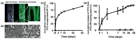 Fabrication of a fluorescence marker enabled nanoparticle-eluting stents using cationic electrodeposition coating technology. (a) Light and fluorescence microscopic images of fluorescence marker enabled nanoparticle-eluting stents. Scale bar = 1 mm. (b) Scanning electron microscopic image showing the nanoparticle-eluting stents (scale bar: left = 1 μm; right = 100 nm). (c) In vitro cumulative release profile of Fluorescein Isothiocyanate (FITC) (a fluorescence marker) encapsulated nanoparticles. (d) In vitro cumulative release profile of FITC (a fluorescence marker) from nanoparticles-eluting stents. Reproduced with permission from [105].