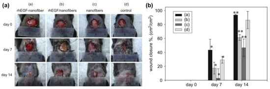 (a) In vivo evaluation of wound healing using a mouse model for comparison of epidermal growth factor-immobilized nanofibers with blank nanofibers and controls. (b) Quantitative analysis of wound-closure rates in the diabetic mice for epidermal growth factor-immobilized nanofibers with blank nanofibers and controls. * and ** indicate statistical significances p < 0.05. Reproduced with permission from [147].