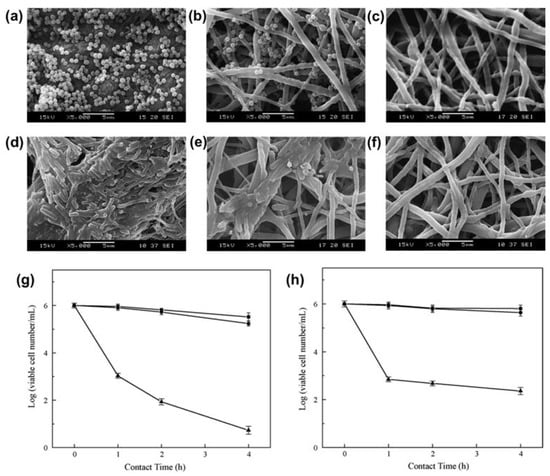 Scanning electron microscopic images of (a,d) filter paper (control), (b,e) pristine, and (c,f) modified polyurethane (PU) fibrous membranes after immersed in phosphate-buffered saline (PBS) suspension of (a–c) S. aureus, or (d–f) E. coli for 4 h. Scale bar = 5 μm. (g) Cell viability study of S. aureus, and (h) E. coli as a function time in contact with control (filled square), pristine (filled circle), and modified PU fibrous membranes (filled triangle). Reproduced with permission from [153].