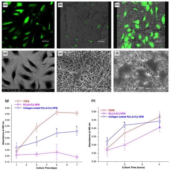 Laser scanning confocal microscopic and scanning electron microscopic images of human coronary artery endothelial cells cultured after three days on (a,d) tissue culture polystyrene plates, (b,e) poly(l-lactic acid)-co-polycaprolactone nanofiber meshes, and (c,f) collagen-coated poly(l-lactic acid)-co-polycaprolactone nanofiber meshes. (g) The viability of human coronary artery endothelial cells on various substrates for seven days (n = 3). An asterisk denotes a significance of p < 0.05 compared to the poly(l-lactic acid)-co-polycaprolactone nanofiber meshes group. (h) Attachment of human coronary artery endothelial cells on various substrates after four days (n = 3). An asterisk denotes a significance of p < 0.05 as compared to the poly(l-lactic acid)-co-polycaprolactone nanofiber meshes group. Reproduced with permission from [162].