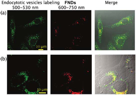 - Liu, K.K.; Wang, C.C.; Cheng, C.L.; Chao, J.I. Endocytic carboxylated nanodiamond for the labeling and tracking of cell division and differentiation in cancer and stem cells. Biomaterials 2009, 30, 4249–4259. [Google Scholar] [CrossRef] [PubMed]