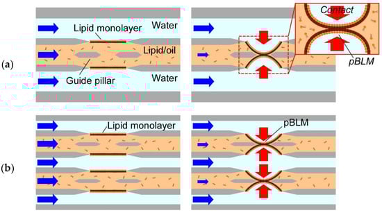 Concept of our formation method of pBLMs. (a) By applying the strategy of the DCM to pBLM formation using microfluidic techniques, a pBLM with open flow channels on both sides can be prepared. (b) Double-stacked pBLMs can be formed using our method.