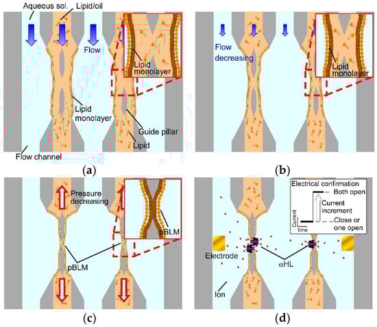 Planar bilayer lipid membranes (pBLMs) are powerful tools for measuring ion channels [1,2], pore-forming proteins [3,4], peptides [5,6,7], and synthetic channels [8,9], owing to their transport activities that can be evaluated via electrical measurements. Furthermore, nanopore sensing with biological nanopores reconstituted into the pBLM offers an opportunity for extremely sensitive and selective biosensors by measuring the change of ion current caused by the reversible binding or translocation of a single molecule in a single nanopore. These sensors are attracting attention as a DNA sequencer [10,11] and a detection method of biomolecules [12,13] because of their high sensitivity and molecular selectively. Recently, a combination of nanopore sensing and DNA computing [14,15] and nanopore systems with multiple-stacked pBLMs [16,17,18,19] have been reported, and they led to multi-functional sensors and cascade type nanopore-based calculators. Especially, multiple-pBLM systems will broaden the field of application such as electronic components, light-sensors, and batteries because of electrical characteristics of pBLMs and membrane proteins such as high capacitance and resistance of pBLMs and permselectivity of membrane proteins [16,17,18]. We also reported a stacked biofuel cell system in which each cell is isolated by pBLMs to apply as the battery of bio-robots [17]. Although the multiple-stacked pBLMs have potential, few methods to form multiple-stacked pBLMs in micro-meter space have been considered. pBLMs are generally prepared using the Montal–Mueller method, wherein two lipid monolayers formed at the air-water interface are attached in the hole of a Teflon wall (Figure S1a). This method is very time-consuming, and the membrane is not stable. Therefore, in the last decade, numerous studies have attempted to use microfluidic technologies to improve the throughput of the pBLM formation [20,21,22,23,24,25,26]. Arrayed pBLMs are automatically formed by sequentially flowing aqueous and lipid/oil solutions through microchannels comprising a main flow channel and closed chambers (Figure S1b). Furthermore, microfluidic technologies have been applied not only to provide high-throughput platforms but also to increase the stability of the pBLMs and to reduce the noise level for electrophysiological measurements, and to be able to flush/refresh solutions [27,28,29,30,31]. However, these microfluidic methods have not been applied to the formation of multiple-stacked pBLMs. On the other hand, the droplet contact method (DCM) [22,32,33,34,35,36] has been reported to prepare stable pBLMs. Using this method, pBLMs are formed by contacting two droplets that are surrounded by a lipid monolayer (Figure S1d). The durability of the membranes formed using DCM is improved; pBLMs can be maintained for a long time (2 weeks) and are stable against mechanical vibration [36], because much of the lipid/oil solution is located around the area of lipid bilayer, and lipid molecules can be supplied and supported to the membrane region (Figure S1d). Furthermore, multiple-stacked pBLMs formed by DCMs have been reported [32,33,37,38]. Although stable pBLMs can be prepared by the DCM-based formation, DCM-based methods have some disadvantages for stacking pBLMs. First, the distance of each pBLM becomes more than hundreds of micrometers. Because the running time of nanopore-based cascade systems depends on the distance, we have to miniaturize the nanopore device to improve the running time. However, the electrodes insertion for measurements of ion currents must be required, and the size of droplets should be bigger than the one of electrodes. In fact, the size of droplets was about 500 μm in diameter, and the gap of pBLMs was also 500 μm in the DCM-based microfluidic formation of stacked pBLMs [38]. Second, the inner solution in micrometers scale droplets cannot be exchanged. Although some solution exchanges and, additionally, chemical injections would be required to develop nanopore-based systems with multiple chemical reactions and sensing, exchanging the inner solution is very difficult, because droplets are isolated from other aqueous solutions by being surrounded with an oil solution.