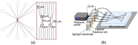 1,2-Diphytanoyl-sn-glycero-3-phosphocholine (DPhPC; Avanti Polar Lipids, Alabaster, AL, USA) and hexadecane (Wako Pure Chemical Industries, Ltd., Osaka, Japan) were used as the lipid/oil solution. Potassium chloride (KCl; Nacalai Tesque, Kyoto, Japan) and 3-morpholinopropane-1-sulfonic acid (MOPS; Nacalai Tesque, Kyoto, Japan) were used as the aqueous solution (1.0 M KCl, 10 mM MOPS, pH 7.0). The MOPS solution was prepared using ultrapure water from a Milli-Q (Merck Millipore Corp., Billerica, MA, USA). Alpha-hemolysin (αHL; Sigma-Aldrich, St. Louis, MO, USA) was obtained as a monomer protein isolated from Staphylococcus aureus in the form of a powder, dissolved at a concentration of 1 mg/mL in ultrapure water, and stored at −80 °C. For use, samples were diluted in the designated concentration using a buffered electrolyte solution and stored at 4 °C. SU-8 3025 (MicroChem Corp., Newton, MA, USA) was used as a photoresist. Polydimethylsiloxane (PDMS; Sylgard 184, Dow Corning Toray Co., Ltd., Tokyo, Japan) was used for the material of microchannels.