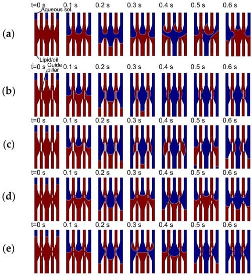 Simulation results of microfluidic behaviors (a) without guide pillars and with guide pillars with a width of (b) 10 μm, (c) 20 μm, (d) 10 μm and a gap of 30 μm, and (e) 10 μm and with a gap of 10 μm). In the conditions of (a,c,d), all solutions were jumbled. In the conditions of (b,e), all solutions flowed straight, and a five-layered flow was formed. Blue and red colors show the aqueous and lipid/oil solutions.
