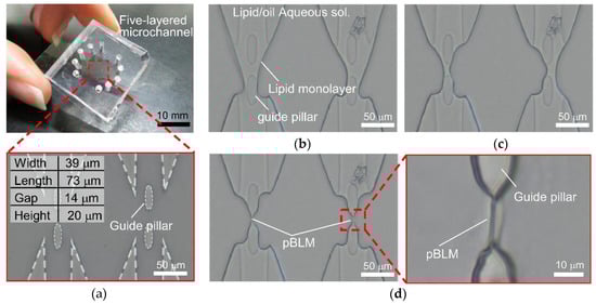 The five-layered microchannels comprised five inlets, five outlets, area confluent area joining all channels, and guide pillars in the confluent area. In the microchannels, double-stacked pBLMs are formed as follows. First, the aqueous and lipid/oil solutions flow to each channel to form a five-layered flow with three aqueous solution layers and two lipid/oil solution layers in the confluent area (Figure 2a). At that time, lipid monolayers spontaneously form at the interfaces between the aqueous and lipid/oil solutions. Then, the flow pressures decrease to stabilize the interfaces between the aqueous and lipid/oil solutions (Figure 2b). Finally, the lipid monolayers are contacted in the gaps of pillars by reducing the flow pressure of the lipid/oil solutions (Figure 2c). As a result, pBLMs are formed, and membrane proteins can be reconstituted to the pBLMs (Figure 2d). To form double-stacked pBLMs using the above method, we set micro guide pillars with hydrophobicity at the midpoints of the channel for increasing the area of the hydrophobic surface. The guide pillars have a dual function as follows. One is to guide the lipid/oil solution along their surface because of their hydrophobicity. Second is the aperture for the contact area of two lipid monolayers. Restricting the contact area of the two lipid monolayers may increase the stability of the BLMs.