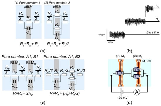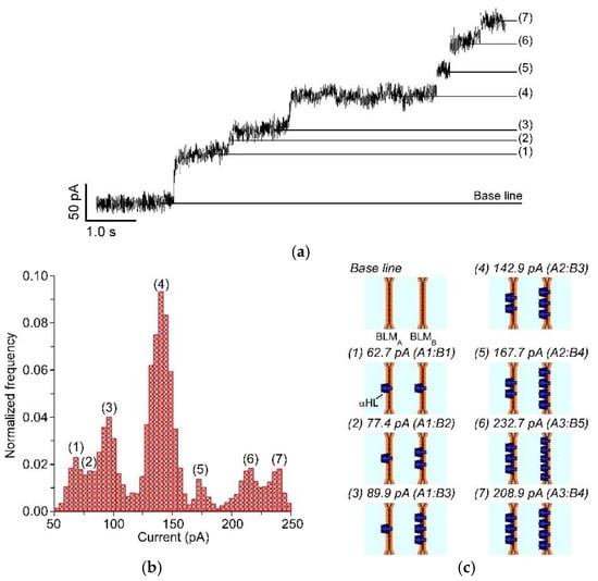 We demonstrated channel current measurements of αHL through double-stacked pBLMs (Figure 6 and Figure S6) to confirm the formation of pBLMs. Although the formation of pBLMs is usually confirmed by measuring membrane capacitances of pBLMs, we evaluated the formation of pBLMs by the reconstitution of αHL pores, because it is difficult to show the doubled-stacked structure from the membrane capacitance. Initially, the current was 0 pA when both or one of the pBLMs were not formed. Then, when both pBLMs formed and αHLs were reconstituted in the double-stacked pBLMs, step-like currents were clearly observed, as shown in Figure 6a. One step indicates a single αHL reconstitution. In our systems, current can be observed when αHLs form pores in both pBLMs [38]. Next, we estimated the number of pores in each pBLM using the model of equivalent circuit (Figure 7). In the case of a single pBLM with αHL pores, the electrical circuit of the nanopore system is shown in Figure 7a, and the total resistance (RS) of the single pBLM with nanopores is calculated using Equation (1).