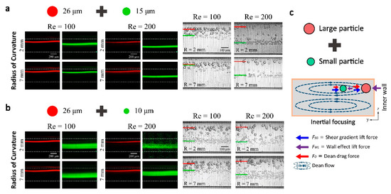 Figure 4. Demonstration of particle separation. The mixed particle suspension flowed and particle distributions were observed near the outlet for particle mixture of (a) 26 and 15 μm and (b) 26 and 10 μm. Fluorescent streak images on the left and the stacked high-speed images (200 images) on the right. The inertial focusing and the separation distance can be controlled with the flow rate and the radius of curvature; (c) Separation principle based on force balance between inertial lift forces and Dean drag force.