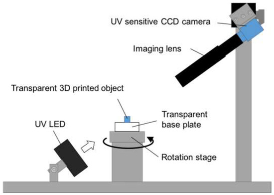 To overcome the above limitation of the conventional SFS method using visible light, we propose a novel method to acquire the shape of transparent 3D printed parts using UV illumination in this study. Most of the transparent 3D polymer parts produced by stereolithography absorb little visible light but absorb UV light strongly. Thus, it is possible to obtain high-contrast silhouette images using UV illumination. For this reason, even transparent 3D printed parts can be evaluated using the SFS method with UV light. Although there are some alternative methods for this, including local heating using infrared light [13] and the polarization of the reflected and emitted light [14], our method has advantages including the ability to capture silhouette images without a background subtraction process and a relatively high resolution as a result of the use of UV light.