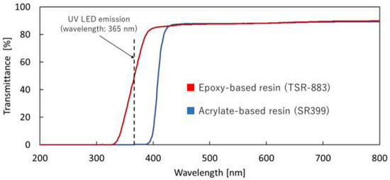 To measure the transmittance values of the two kinds of cured resins, thin films with a thickness of approximately 200 μm were prepared by curing both resins with a UV lamp. The transmission spectra of the thin films were measured using a UV-visible spectrometer (UV-1700, SHIMADZU Corp., Kyoto, Japan) (Figure 3). The transmittance values of the acrylate-based and epoxy-based resins at the UV LED emission peak wavelength (365 nm) were 0.1% and 46.3%, respectively. Therefore, the acrylate-based resin was considered suitable for obtaining high-contrast silhouette images using the UV LED. Although the UV absorption of the epoxy-based resin was lower than that of the acrylate-based resin, it could also be used to obtain a sufficient number of high-contrast silhouette images after proper binarization without a background subtraction process, as shown in the following experiments.