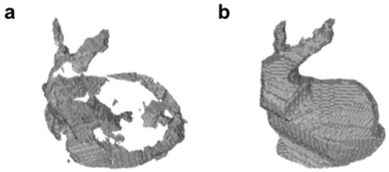 The 3D shape of the bunny model was reconstructed using the SFS method with visible and UV light. Figure 5 shows the reconstructed triangular mesh models. As Figure 5a shows, some portions of the bunny model could not be reconstructed using visible light. On the other hand, all portions of the bunny model were completely reconstructed using UV light. This was because the use of high-contrast silhouette images with slightly uneven brightness levels made it possible to obtain the correct visual hull of the target object.