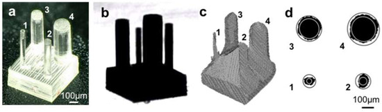 To evaluate the accuracy of the 3D shape acquisition system, a pillar array model (Figure 6a) containing pillars of different diameters was fabricated using micro-stereolithography based on the top-down system. The diameter of each of the actual pillars was measured using an optical microscope; these results are summarized in Table 1. Figure 6b shows the silhouette image of the pillar array model captured using UV transmitted illumination. All of the pillars were captured with high contrast. The 3D shape of the pillar array model was reconstructed using multiple silhouette images taken from different viewpoints (Figure 6c). Although the smallest pillar was slightly distorted, all the pillars were reconstructed. The average diameter of each of the reconstructed pillars was calculated using a cross section at half the height of each pillar. In this calculation, we used the average of an inscribed circle and a circumscribed circle for each pillar, as shown in Figure 6c. The averaged diameters of these reconstructed pillars are summarized in Table 1. In these results, the difference between the actual and averaged diameters of the reconstructed pillars ranged from 1–20 µm.