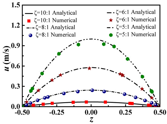 As shown in Figure 2, the numerical solutions agree well with the analytical solutions with a large aspect ratio, indicating that the purposed model is accurate and reliable. In considering the small aspect ratio, the numerical solutions are slightly different from the analytical solutions, indicating that the analytical model cannot accurately describe the flow process in the electromagnetically-driven microchannel, and strict three-dimensional numerical simulation methods should be adopted.