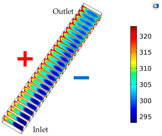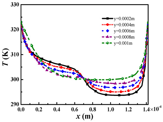 Figure 3 and Figure 4 show the temperature distribution in the microchannel under the electromagnetically-driven system, with boundary temperature Tw = 323.15 K and initial temperature T0 = 293.15 K. The aspect ratio of the microchannel is 2. The electrolyte solution flows through the microchannel to achieve heat convection, and its temperature significantly increases at the outlet. Figure 4 shows the temperature distribution along the midline of the x–z plane at a different y-direction position. As shown in Figure 4, as the fluid flow and the temperature distribution of the electrolyte solution becomes flat, and the temperature near the high-potential wall is obviously higher than that of low-potential wall. Therefore, it can be concluded that the heat convective of the electromagnetically-driven electrolyte solution is better on the high-potential wall than low-potential wall. Since the induced electromotive force generated by fluid flow introduces a stronger velocity near the high-potential wall, the heat convection is more intense, and the temperature of the electrolyte solution near the high-potential wall increase significantly.