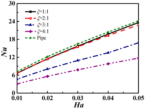 Firstly, the sensitivity of the Ha number on the Nu number was analyzed when the magnetic direction was perpendicular to the axis of the microchannel; the results are shown in Figure 9.