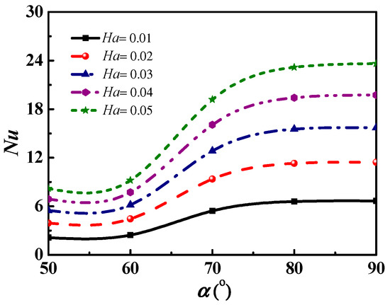 Figure 7 demonstrates that an increase in Ha number will enhance the regulation effect of the magnetic direction. The Lorentz force is more significantly affected by the angle α with a large Ha number. Besides, when the angle α is 60°~80°, the Nu number varies most obviously due to the significant change of the sine value and the volumetric force.