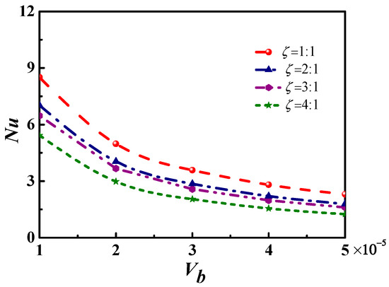 For a certain microchannel, the heat convection can be regulated by adjusting the potential difference between two electrodes. Figure 8 shows that the Nu number decreases as the Vb increases, due to the inverse proportion between the Vb number and the potential difference. Therefore, the increase in Vb will reduce the potential difference and the Lorentz force of the ion.