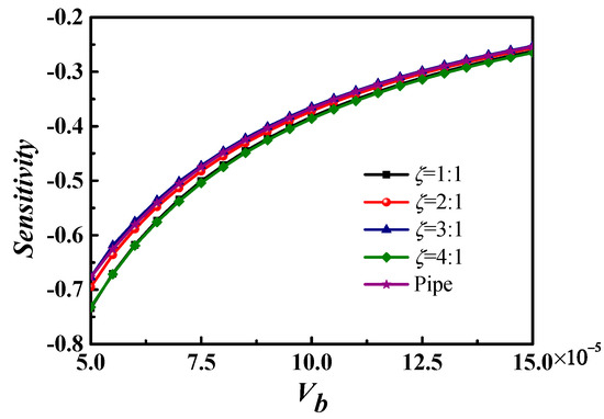 This part studies the sensitivity of the Vb number on the Nu number. Figure 10 demonstrates that the sensitivity of the Vb number is negative, since the Vb number is inversely proportional to the potential difference. The sensitivity decreases as the Vb number increases, meaning that the regulating ability of the Vb number on Nu is stronger at a smaller Vb number, and weaker at a larger Vb number. The sensitivity coefficients with different aspect ratios show that the aspect ratio has a small impact on the sensitivity coefficient. The sensitivity of the aspect ratio 1:1 and 4:1 was slightly larger than that of other microchannels.