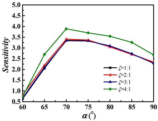 At last, the sensitivity of the magnetic direction angle α on the Nu number is analyzed; the results are shown in Figure 11. When the angle α varies from 60° to 90°, the sensitivity coefficient of the Nu number increases obviously as the angle α increases, and reaches maximum at α = 70°. After that, the sensitivity coefficient decreases slowly. Therefore, the magnetic direction angle has the strongest adjustment ability to the Nu number at about 70°, and the larger direction angle (over 70°) has a stronger adjustment ability than smaller angles (below 70°). The sensitivity coefficient of different aspect ratios shows that the regulating ability of the magnetic direction on the Nu number with an aspect ratio of 4:1 is obviously better than that of other aspect ratios.