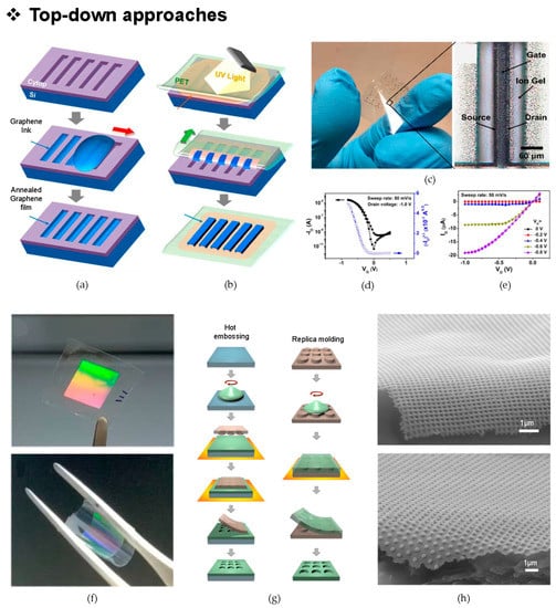 Graphene lines-based flexible transistor/hydroxypropyl cellulose (HPC) photonic thin film with a hexagonal nanopillar structure: (a) a schematic of the fabrication of the Cytop/Si mold; (b) simple procedures for transferring graphene lines from the Cytop/Si mold to the polyethylene terephthalate (PET) flexible substrate; (c) an image of flexible electrolyte-gated transistor (EGT) arrays, the magnified picture shows the composition of each transistor; (d,e) the transfer and output characteristics of the graphene electrodes, Reproduced with permission from 2017 ACS NANO [37]; (f) images of an HPC photonic crystal (top) and its mechanical flexibility with a free-standing property of the design (bottom); (g) schematics of two fabrication processes to make HPC photonic films-hot embossing and replica molding methods. The blue-colored slide indicates the glass substrate, the green one for HPC, and the brown one for hard polydimethylsiloxane (h-PDMS); (h) special hexagonal nanopillar images obtained by scanning electron microscopy (SEM) in the lateral view. Paper substrates are used to imprint the predesigned nanopattern. Reproduced with permission from 2018 Nature [38].