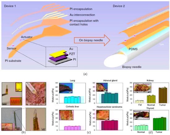 In the first instance, to distinguish the normal tissue from abnormal, a highly flexible microscale piezoelectric device is developed [50]. Exploiting the alteration of the mechanical properties of tissue modulus in accordance with lesion expression [51,52,53,54,55], a novel minimally invasive probe offers quantitative agreement with clinical insights. The magnified schematic views of the specific structures are shown in Figure 2a. The thin, photolithographically patterned and defined triple-layer membrane, which is composed of Au/Cr, the piezoelectric material lead zirconate titanate (PZT), and Ti/Pt, is used as both an actuator and a sensor, simultaneously. Each of the components is transfer-printed onto the polyimide (PI) substrate from the donor wafer, regardless of the structure, in the form of either a free-standing device or integrated on a biopsy needle. After encapsulating the triple layer with PI, another layer of PI is used for encapsulation, after the deposition of the interconnecting Au lines. Figure 2b shows the images of the freestanding probe that has been placed into a biological tissue environment and the device has been wrapped around the surface of a conventional biopsy needle. The bottom right magnified image in Figure 2b designates the point of the actuator/sensor region on the needle. The fundamental device operation is based on the piezoelectric effect [56,57,58,59,60]. When the device achieves conformal contact with the tissue interface, the induced potential results in the piezoelectric strain at the actuator. The tissue that exhibits the deformation transfers this force to the sensor, and then, a portion of the strain force is changed into a certain value of voltage, thereby realizing the measurement of the tissue modulus. Figure 2c shows the results of the tissue modulus determination that has been conducted in human organs, such as fresh lung, adrenal gland, and fresh cirrhotic liver, as well as in a hepatocellular carcinoma. As estimated, Figure 2c provides the information that the cirrhotic liver maintains an average modulus of approximately 10 kPa, while the cancerous hepatocellular tissue reaches a peak modulus of approximately 23 kPa. The modulus graph in Figure 2d also shows the different modulus values that have been acquired between the fresh tissue and the abnormal tissue regions in the human thyroid and a formalin-treated kidney. In this example, the devices offer an underwork for the modulus-measuring platforms for biopsy guidance, based on magnetic resonance elastography [61,62,63,64,65].