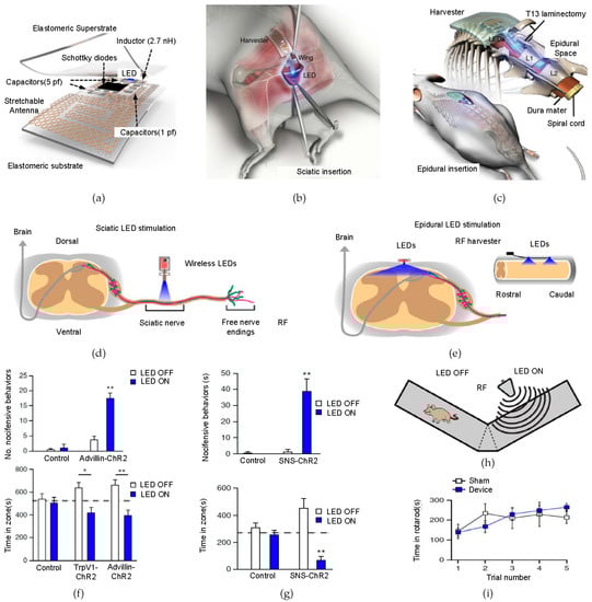 Fully implantable, flexible system for a wireless optogenetic stimulator with related experiments. (a) Schematic of a fully implantable, flexible electronic system for a wireless optogenetic stimulator; (b) images of the sciatic insertion surgery to implant the completed device into the spinal cord. The wing-shaped light emitting diode (LED) extension site passes from the gluteus maximus to the sciatic nerves; (c) a similar implantation is conducted at the epidural space in the spinal cord; (d,e) an illustration of the nociception path with an LED stimulator in a sciatic nerve and epidural space; (f,g) graphs of number of adverse behaviors/time in y-maze observed by the Advillin-ChR2-treated rodents in accordance with the LED stimulation in the sciatic nerve and epidural space; (h) an illustration of the experimental y-maze. Using radio-frequency (RF) signal, pathways are separated by LED on/off environments; (i) the graph of a rotarod performance result. This graph shows that motor activity does not change the entire performance of the device. Reproduced with permission from 2015 Nature [77].