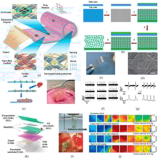 The method of releasing an active device from a rigid substrate to obtain device mechanical flexibility is efficiently used in multifunctional cardiac patches (Figure 4a) [80]. These novel cardiac patches are composed of three main parts, namely, an electronic system for sensing and stimulating, electroactive polymer-deposited electrode sites for chemical factor diffusion to control cellular function, and three-dimensional (3D) dense nanofiber scaffolds in the cardiac cell environment. A detailed fabrication process is illustrated in Figure 4b. The device fabrication begins with depositing nickel as a relief layer onto a silicon substrate. Then, the spin-casting and curing of SU-8 photoresist on the surface of the Ni layer occurs, which is followed by the Cr/Au metal lift-off process. Subsequently, a titanium nitride (TiN) layer is deposited on the gold pads by sputtering, so as to increase their surface area. The passivated components of the design are released from the previous silicon substrate, and the remaining free-standing, flexible structure is obtained by etching the Ni relief layer using nitric acid. Figure 4c is an image of the flexible device, which consists of 32 electrodes with an SU-8 mesh structure.