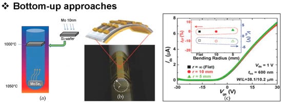 The components of flexible electronic devices at the nanoscale can be fabricated using the stacking of atoms or chemicals from the bottom to the top, referred to as bottom-up approaches. Such methods have distinct advantages in certain aspects compared to top-down approaches. The device fabrication process can be controlled precisely using bottom-up approaches and can be achieved at a relatively lower temperature, so that there is no risk of substrate deformation as a result of the applied heat [82]. There are various approaches to fabricate device components with novel materials using bottom-up approaches, such as growth methods [83,84,85,86,87], assembly methods [88,89,90], and chemical vapor deposition (CVD) [91,92,93,94,95,96]. Here, we introduce various applications for flexible electronic devices that have been fabricated by bottom-up approaches, such as a flexible transistor based on a MoSe2 film, flexible light emitting diodes (LEDs) [93], a flexible touch screen [90], flexible strain sensors [83,88,89,97], and flexible temperature sensors [91].