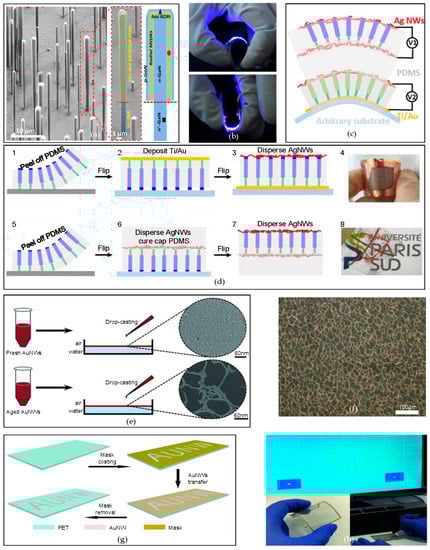 Flexible light emitting diodes based on vertically grown nitride nanowires/transparent and flexible nanomesh via self-assembly of ultrathin gold nanowires to fabricate a flexible touch panel. (a) An scanning electron microscope (SEM) image of a grown individual nanowire obtained with a tilt angle of 45°; (b) The flexibility of the fabricated nanowire blue LED; (c) A schematic of the bi-layer flexible LED with a blue LED for the top layer and a green LED for the bottom layer; (d) A schematic of the fabrication process for the semitransparent LED (1–4) and fully transparent LED (5–8), Reproduced with permission from 2015 Nano Letters [93]; (e) A transmission electron microscopy (TEM) image of a gold nanowires (AuNW) nanomembrane fabricated by a fresh AuNW solution and an SEM image of a AuNW mesh film fabricated from an aged AuNW solution; (f) An optical image of the AuNW mesh film with pores fabricated by the self-assembly method from an aged AuNW solution; (g) A schematic of the patterning of the AuNW mesh film on PET; and (h) A flexible touch panel fabricated using the AuNW mesh film. Reproduced with permission from 2016 Advanced Electronic Materials [90].