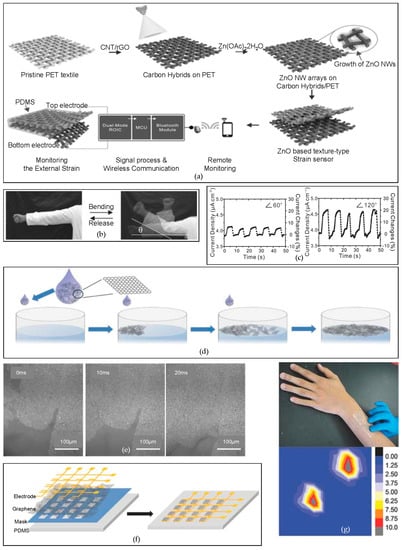 One of the well-known applications of the flexible electronic devices are the flexible sensors. Various types of substrate can be used for flexible strain sensors, from textiles to carbon-based materials. In order to enhance the electrical characteristics of a fabric-based flexible strain sensor, nanowires that are grown on the textile can be used [83]. Herein, a wireless flexible strain sensor is applied on a commercial textile via the assembly of hybrid carbon materials at the nanoscale and piezo-resistive ZnO nanowires (NWs) that have been grown on the commercial textile. The assembled hybrid carbon nanomaterials provide excellent properties in terms of the robust electrical performances against mechanical deformation from bending. On the pristine PET textile, carbon nanotubes (CNTs) and reduced graphene oxide (rGO) are coated so as to provide an excellent growth condition for the ZnO nanowires [113,114]. The coated hybrid carbon nanomaterials provide the continuous conductivity and durability against the externally applied mechanical strain. Then, the ZnO-based texture-type strain sensor is encapsulated with a thin PDMS layer (Figure 7a). Figure 7b,c show the current density change with the bending and the release of the fabricated flexible textile strain sensor. The plots in Figure 7c shows the flexible textile sensor monitoring the repeated bending and release of an arm up to bending angles of 60° and 120°, respectively. The assembled ZnO-3 on the PET substrate textile, which is hybridized with carbon nanomaterials, has a twice-higher gauge factor (GF) of 7.64, than that of ZnO-3 that has been assembled on a plain conventional PET film. This result implies that using the fabric-like structure as the substrate for strain sensors culminates in high-pressure sensitivity and stability at the same time.