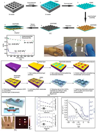 Microstructured graphene arrays for sensitive flexible tactile sensors/electronic skin based on a stretchable transistor array. (a) A schematic of the fabrication of a flexible tactile sensor device via the layer-by-layer (LBL) assembly method. An ultrathin graphene film that detects applied pressure is deposited on the PDMS film; (b) the pressure response curves of unstructured and structured rGO/PDMS films. The slope of the relative resistance change is −5.53 kPa−1 at 100 Pa, which shows very sensitive changes at lower pressures; (c) an image of the tactile senor applied on the flexible substrate. Reproduced with permission from 2014 Small [88]. (d) a schematic of the fabrication process for arrays of flexible transistors; (e) a magnified view of a flexible transistor exhibiting high performance; (f) the mobility and threshold voltage changes when applying strain from 0% to 100%; (g) the I–V characteristics of fabricated transistors, which have almost no hysteresis; (h) stretchable arrays of transistors attached to the human palm with a small artificial lady bug with six legs and the corresponding result from the stretchable sensor. Reproduced with permission from 2018 Nature [97].