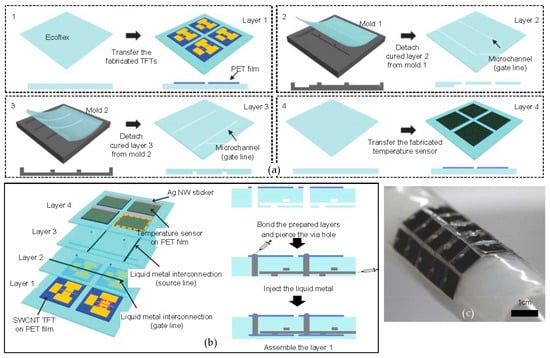 Monitoring the body temperature is important since numerous diseases can be characterized by abnormal changes of body temperature. Therefore, a precise and continuous temperature monitoring device is required. Recent work presents a stretchable and flexible temperature senor in the form of electronic skin, with a stable temperature sensing performance when an external strain is applied [91]. The device consists of a 5 × 5 single-walled carbon nanotube (SWCNT) TFT layer, two liquid metal interconnection layers, and a layer of a 5 × 5 array of temperature sensors. On layer 1, the array of the SWCNT TFTs are on a PET film, having been fabricated via a CVD process and transferred. Layer 2 and layer 3 are microchannel Ecoflex layers, which are formed on a microstructured mold. Layer 4 is the temperature sensing layer with polyaniline temperature sensors on a PET film. Four different layers are electrically connected via a liquid metal that is a compound form of gallium, indium, and tin (Figure 9a,b). Since the device consists of the thin soft elastomer (Ecoflex) and ultrathin active components, the entire device can be stretched up to a strain of 30%, without device fracturing or performance degradation. The completely fabricated temperature sensor can sense both heating and cooling through the normalized resistance change, with respect to the temperature change. There is no hysteresis found in the normalized resistance change for the heating and cooling. Figure 9c shows that the temperature sensor array can be bent up to a radius of 14 mm, while maintaining its electrical performances.