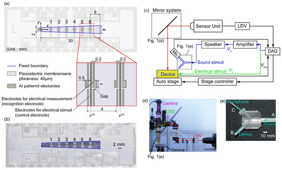 (a) Schematic and (b) photograph of the artificial cochlear epithelium fabricated in this paper. The patterned electrodes were fabricated on a polyvinylidene difluoride (PVDF) piezoelectric membrane with thickness of 40 µm; (c) Overview of the experimental setup. The multichannel analog output module in the data acquisition (DAQ) system was used to apply the sound and electrical stimuli with a desired phase difference. The DAQ system was also used to analyze the electrical output from the device and the results of laser Doppler vibrometer (LDV) measurement. These analyzed data were used in feedback control; (d) Details of the mirror system in panel (c) to observe the exact position of the laser for LDV measurement; (e) Photograph of an acyclic part used to fix the microphone.