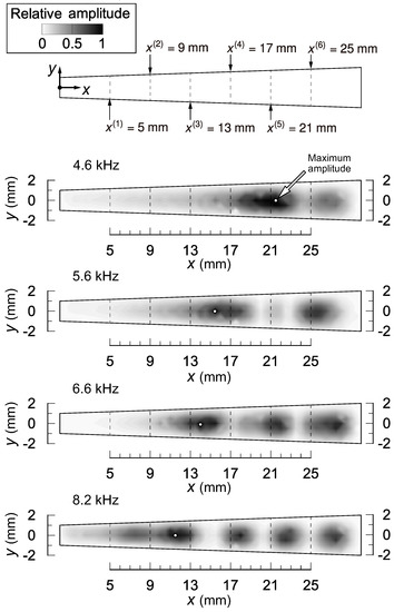 Figure 3a shows the amplitude of membrane vibration on the fifth electrode ( mm) induced by electrical stimuli applied to that electrode with different frequencies 4 kHz 6 kHz and V. The amplitude reached a maximum at kHz, and we thus conclude that the resonant frequency at the position of the fifth electrode was kHz. Before going into further detail, we will compare the experimental results with a theoretical prediction. Assume that the trapezoidal membrane can be considered as sequential beams of length ; that is, we neglect the vibration mode in the x-direction. Then, according to the linear theory of transverse vibration of a beam with fixed ends [35], we obtain the first-order resonant frequency as , where E is the modulus of elasticity, the mass density, the cross-sectional area with h the thickness of the membrane, and the moment of inertia of the cross section about the x-axis. In other words, , which is introduced for notational convenience, should be independent from x; that is, m· s. The experimental values of for positions of the electrodes used in the present study were obtained as m· s. The standard deviation was 3%, and we thus conclude that the linear theory predicts the resonant frequency of the electrodes well. Although the above discussion using beam theory is simple, the main feature of the device’s frequency selectivity is retained. Further details such as vibration mode and phase will be investigated in future work.