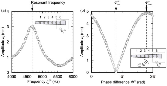 We first show that electrical stimuli induce vibration of the membrane and can be used to determine resonant frequencies at position of the control electrodes by changing in Equation (1) continuously. Note that we measured the vibration of the membrane using an LDV and obtained the amplitude for the frequency component f through Fourier analysis.