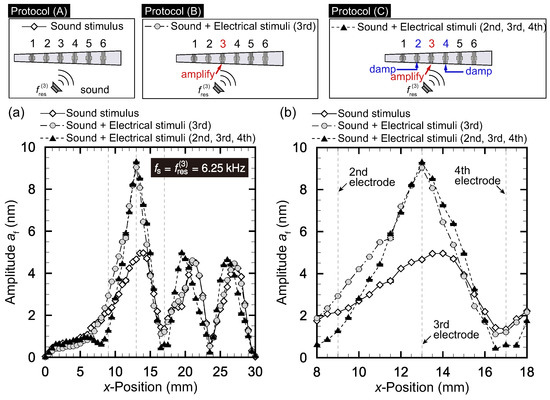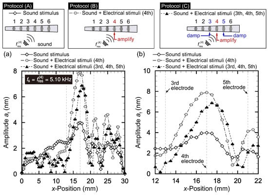 We first focus on Figure 4, where the target electrode is the third electrode. The frequency of sound stimuli was set to the resonant frequency at the position of the third electrode, = 13 mm (i.e., kHz). The result of protocol (A) shows that the amplitude was 4.6 nm at the electrode position of mm, which was slightly smaller than the amplitude nm at mm, even though the sound stimuli were set to the resonant frequency at mm. This is attributed to the fact that the width in the y-direction, , was larger for mm. Note that the amplitude tended to be larger if the width was wider. Moreover, we observed local maxima at mm and mm. These local maxima were related to the oscillation mode in the x direction, which can also be observed in Figure 2 with kHz and in Reference [2]. At this stage, the amplitude at the resonant position was not prominent. We then tried protocol (B), where the electrical stimuli of kHz were applied in addition to the sound stimuli. We observed an obvious amplification as a result of the electrical stimuli, and the amplitude at was 8.9 nm. We finally tried protocol (C), applying the electrical stimuli of kHz with and . Figure 4b shows that the amplitudes at and were successfully suppressed.