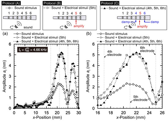 Vibration amplitude distribution for protocol (A): only sinusoidal sound stimuli with kHz; protocol (B): sound and electrical stimuli applied to the fifth electrode; and protocol (C): sound and electrical stimuli applied to the fourth to sixth electrodes. (a) Entire view and (b) magnified version near . Protocol (B) succeeded in amplifying at resonant position mm. In addition to the amplification in Protocol (B), Protocol (C) damped of neighboring positions and , where there were damping controls with opposite phases for the fourth and sixth electrodes.