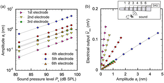 (a) Relationship between amplitude at (i = 1, 2, ⋯, 6) and sound pressure level for kHz. The membrane vibration increased with the sound pressure level applied to the artificial cochlear epithelium. (b) Relationship between electrical output (i = 1, 2, ⋯, 6) and amplitude at for kHz. Amplitude and electrical output from the recognition electrodes had a linear relationship.